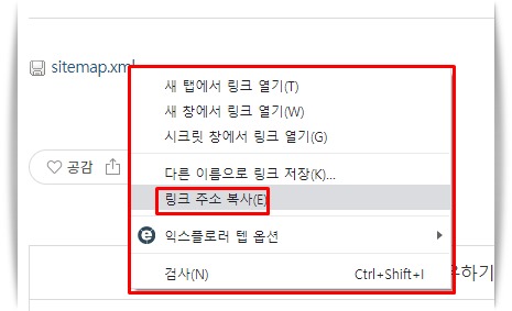 비공개로 글을 발행했다면 해당 포스팅으로 들어 가시면 업로드된 sitemap.xml 파일이 링크 되어 있다는 것을 확인 할 수 있습니다. sitemap.xml에 마우스 커서를 갖두고 마우스 오른쪽 버튼을 클릭하면 링크 주소를 확인 할 수 있습니다.